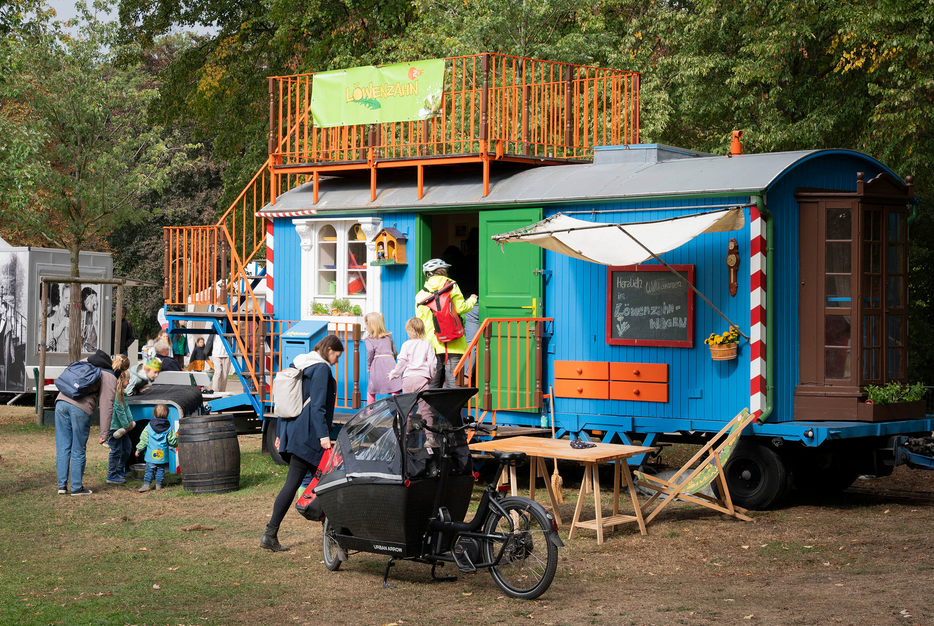 Der bunte Löwenzahn-Bauwagen lädt Kinder zum Entdecken und Mitmachen ein.